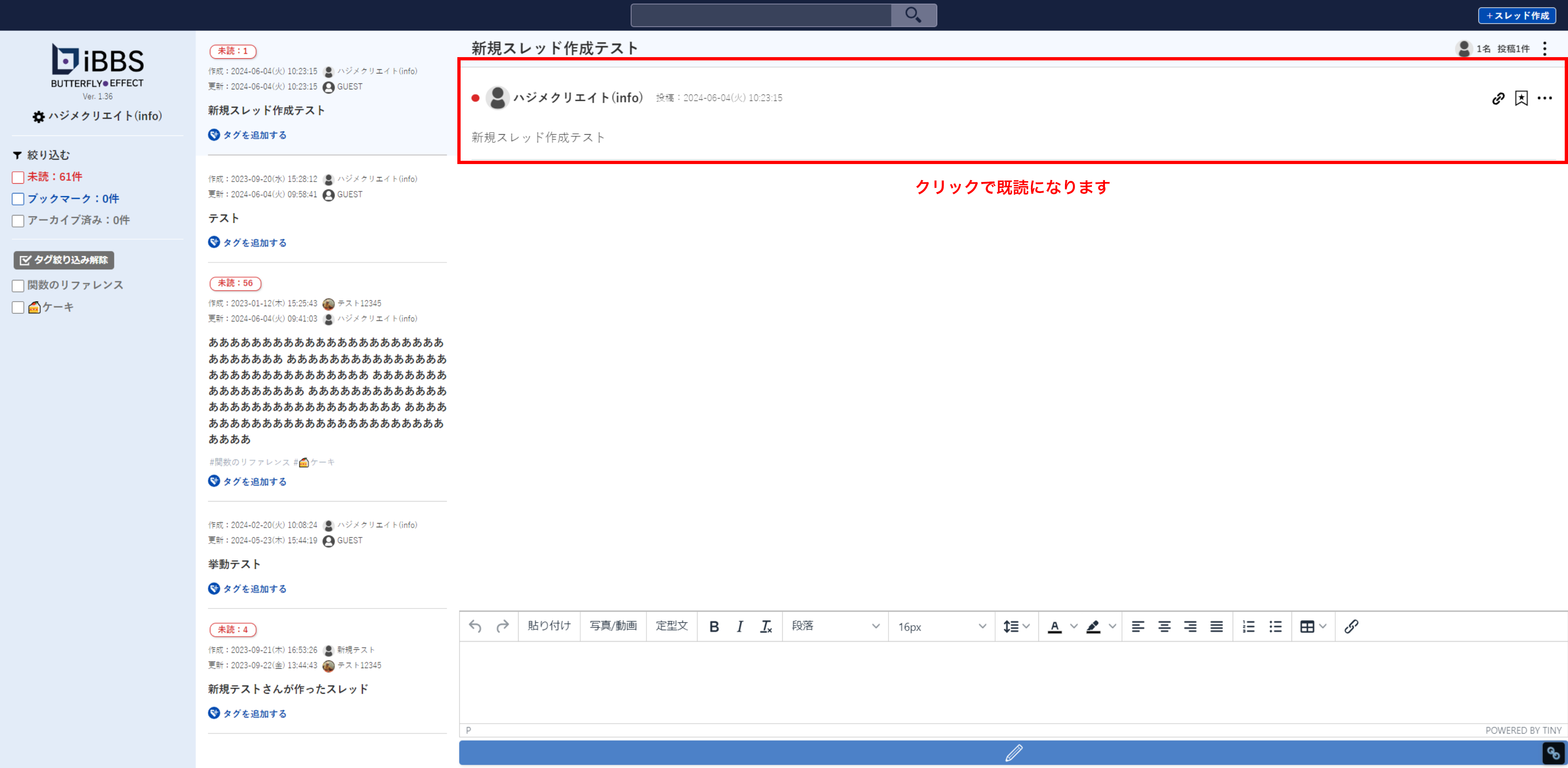 ・「未読」状態のコメント(赤丸のついているもの)をクリックすると既読になります。既読になると、既読一覧にユーザー名が表示されます。(絞り込みから未読コメントのみを選択することができます。)