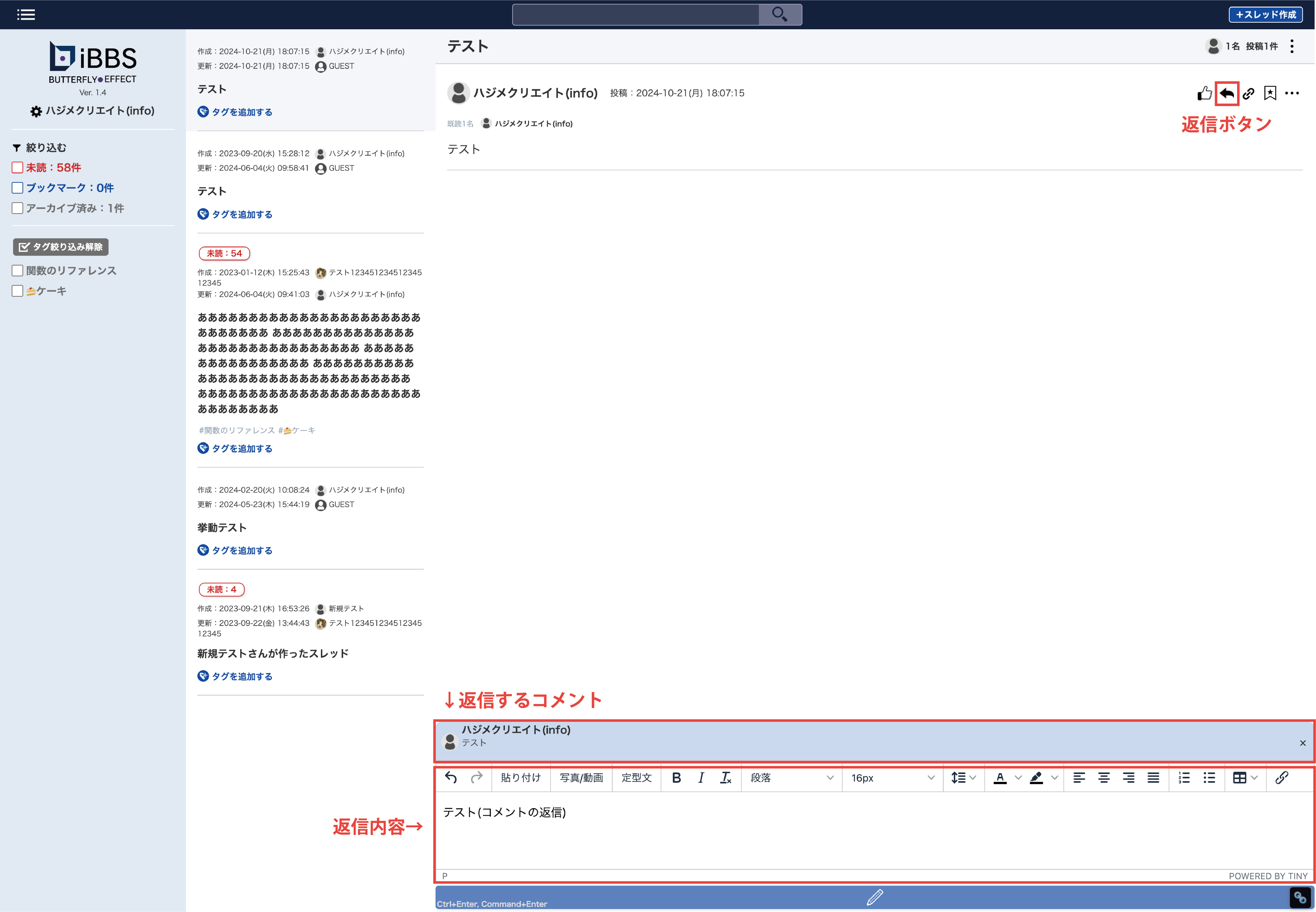 ・コメント欄の右上の矢印をクリックすると、選択したコメントに返信ができます。