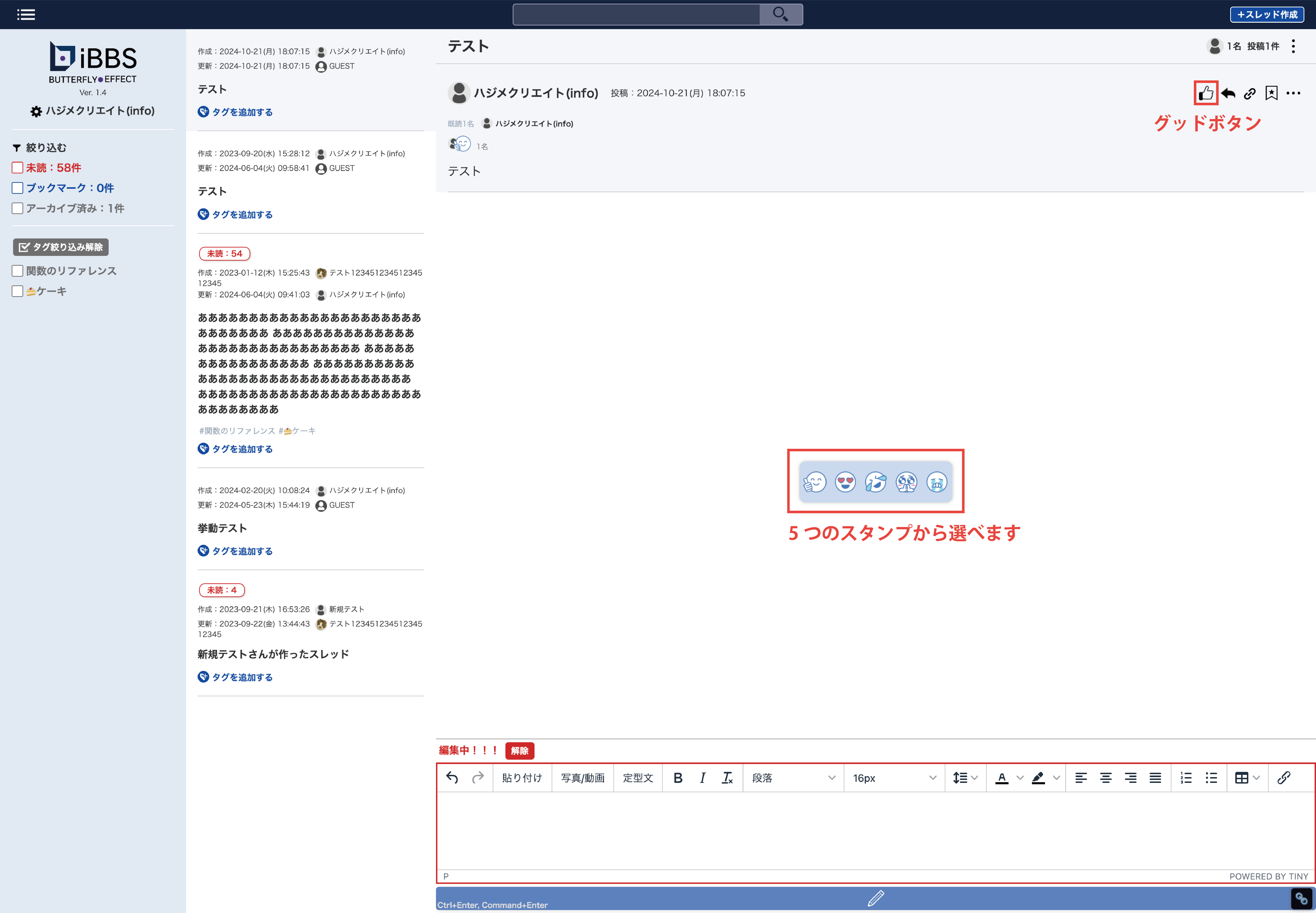 ・コメント欄の右上のグッドボタンをクリックすると、選択したコメントにスタンプで反応ができます。
