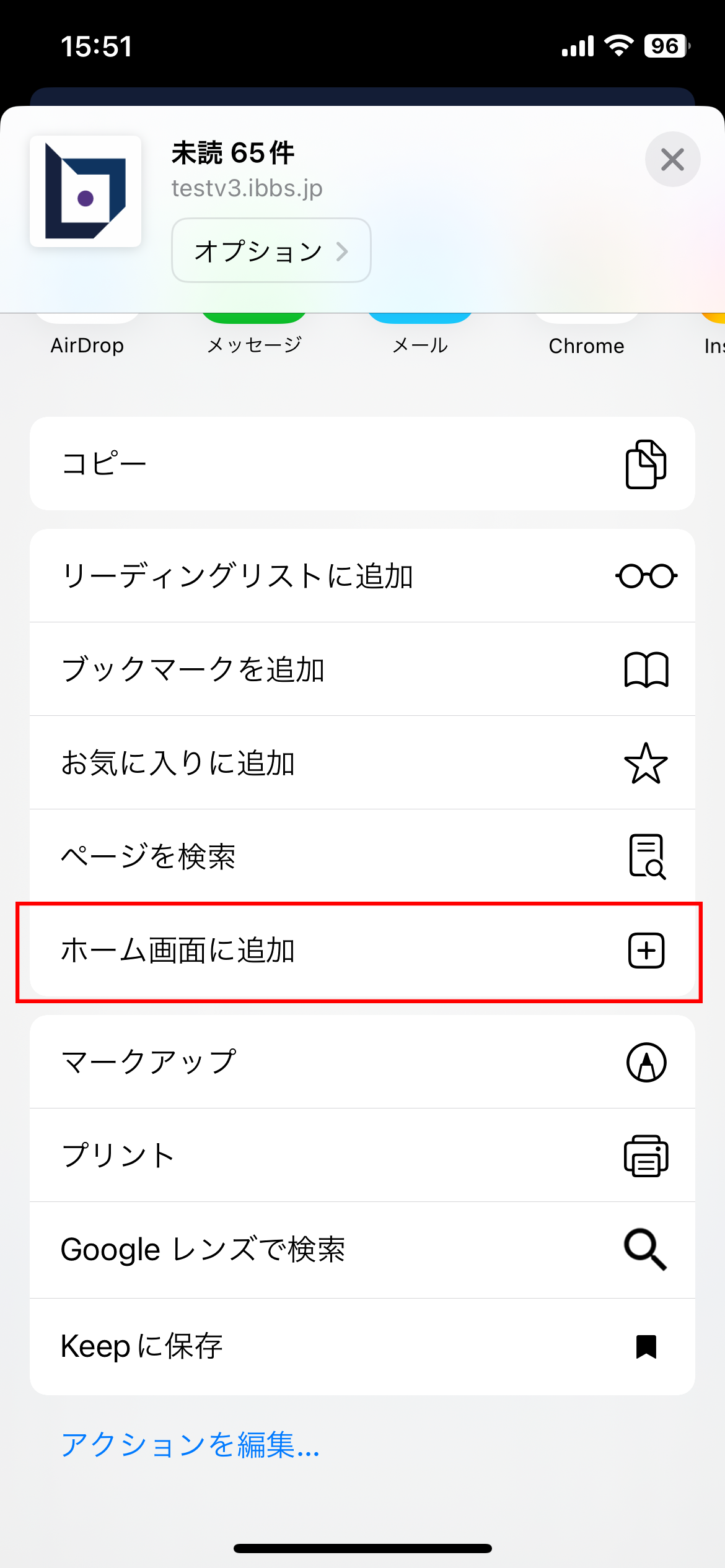 ③ 「ホーム画面に追加」を押下してください。